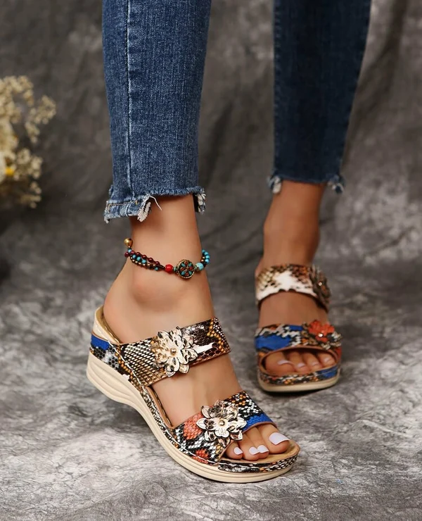 😍Last Day 50% OFF😍-Womens Comfy Leather Solid Flower Strap Wedge Sandals